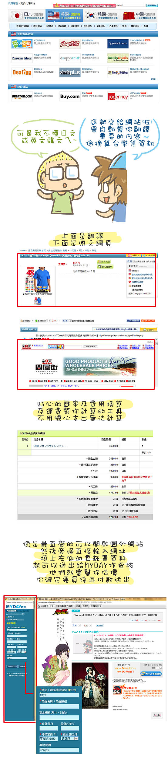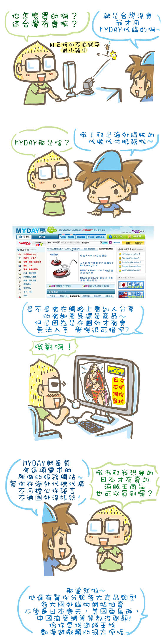 . 連我第一次買都不用人教 就會用了 有這樣的服務 對想海外購物拍賣 有需求的人來說 真的是很方便呢還有提供中文專業客服 打電話或留言都有專人服務與翻譯 我的usb炮塔當初就是在 看到宅宅新聞介紹的趣味玩具新聞裡看到 且那網站沒有在MYDAY推薦連結裡 但是依然可以代購 真的以後 看到什麼海外限定發售的商品 不用再悲傷自己沒認識住國外的朋友 還是不懂英日文的窘境了 如果你也有早就想買很久的 快上MYDAY搜尋看看自己想要的商品吧! MYDAY 買對 官方網站